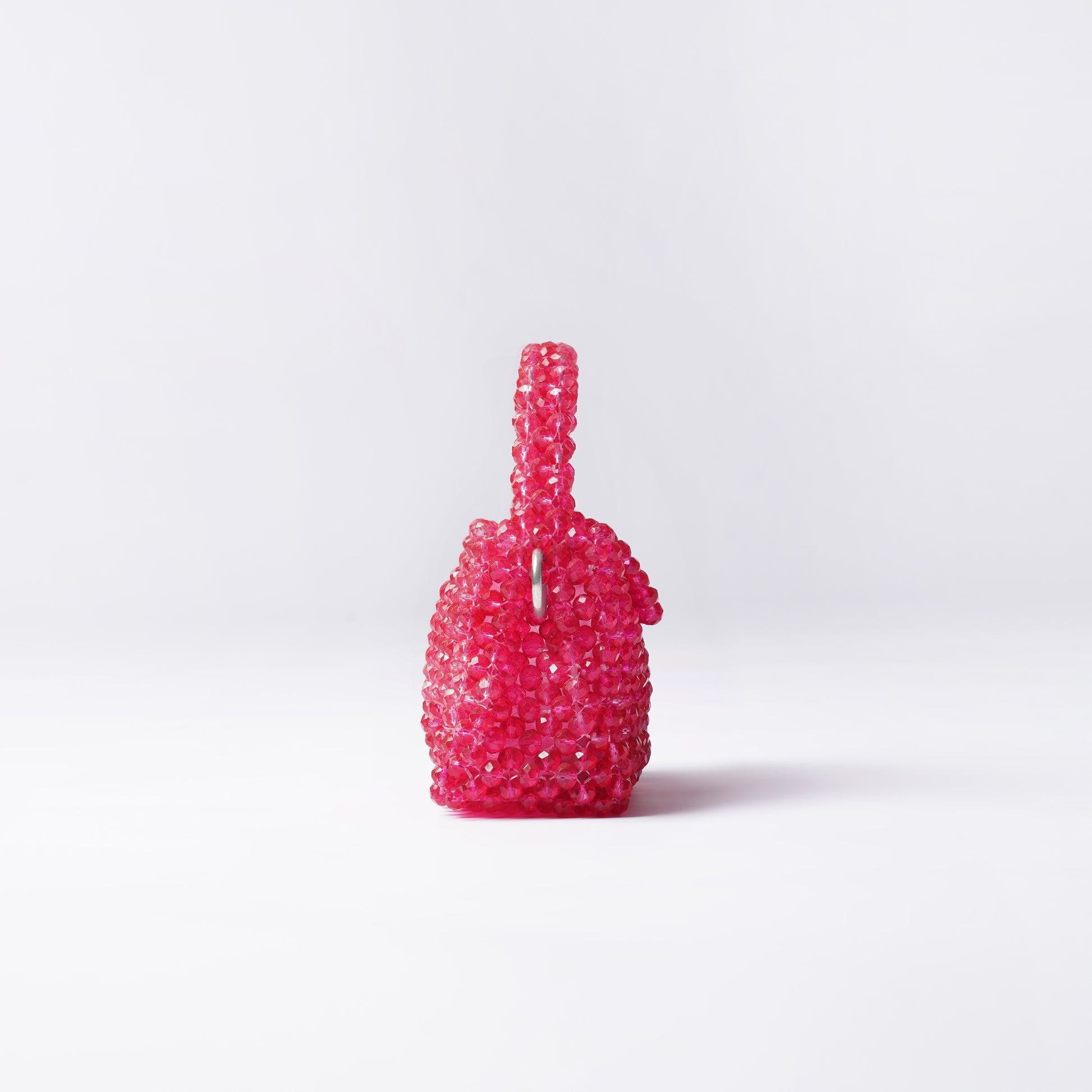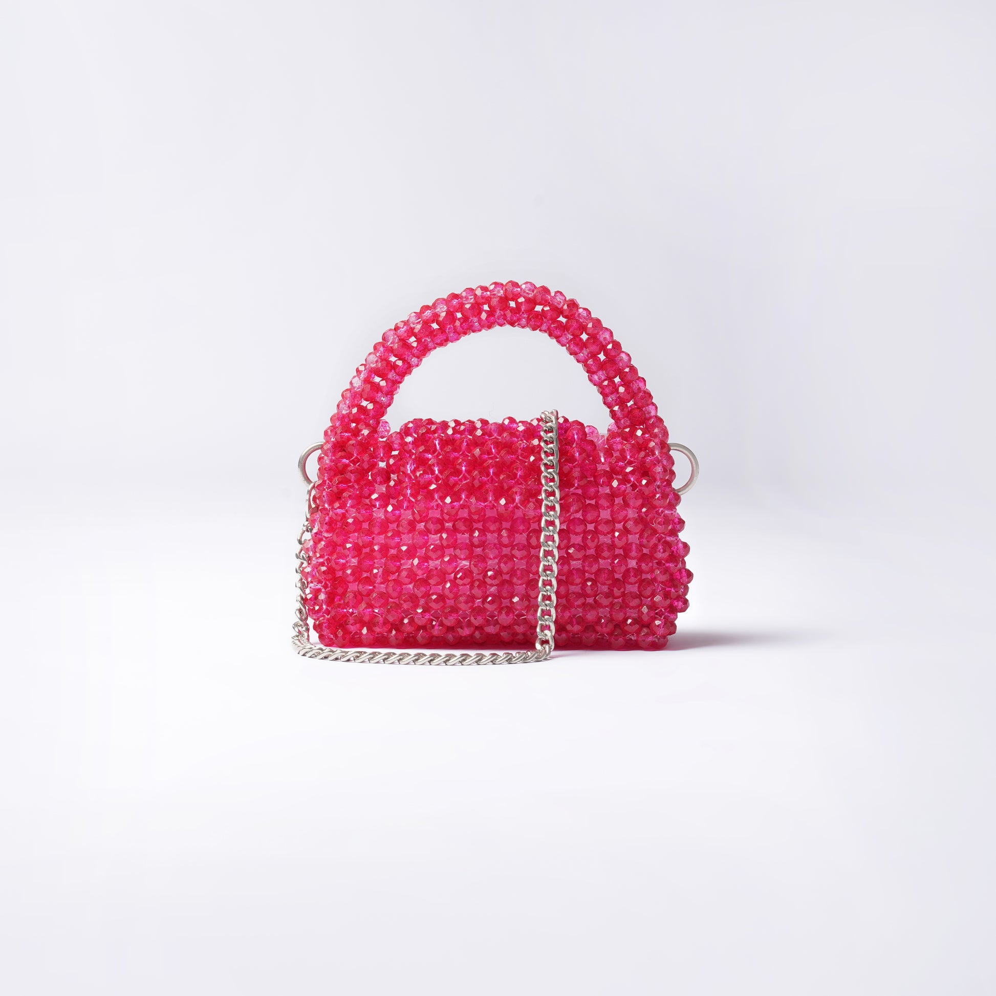 Mini blush bag is a handcrafted statement bag designed to turn heads. Intricately woven with high-shine faceted crystal beads in a striking hot pink hue, this structured mini silhouette reflects light beautifully from every angle.
