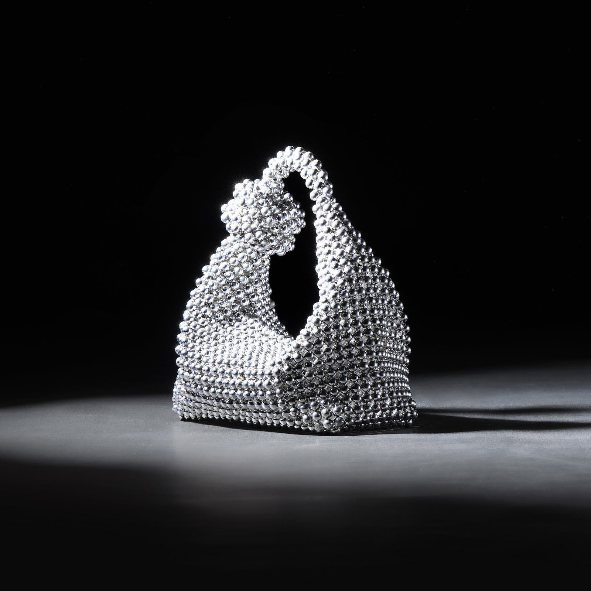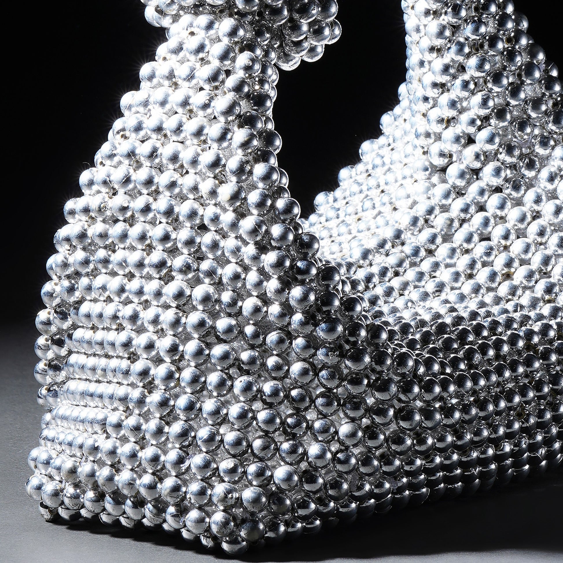 Crafted entirely in luminous silver pearls, its rounded, structured silhouette gives it the charm of a miniature basket — reimagined in a sleek, metallic finish. The curved handle flows seamlessly into the body, creating a bold yet refined statement.